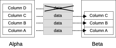 When a record is inserted into cluster Alpha, data for all four columns in the updated table are sent as a binary log to cluster Beta. But since Beta has the old schema, the data for the new column is dropped when the binary log is applied.