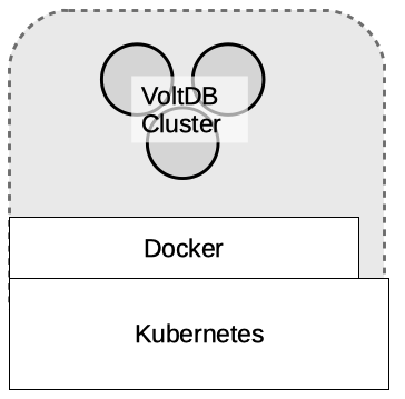 So the basic architecture for running VoltDB is a VoltDB database running on multiple instances of a Docker container inside a Kubernetes cluster.