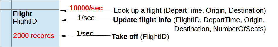 Looking at the workload of the flight reservation example, the Flight table has the most frequent accesses (at 10,000 a second). However, these transactions are read-only and may involve any combination of three columns: the departure time, the point of origin, and the destination. This makes it hard to partition the table in a way that would make the transaction single-partitioned because the lookup is not restricted to one table column.