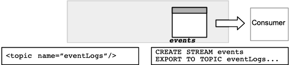 </topics>For output, you include the EXPORT TO TOPIC clause when you declare a stream or table. Once the schema object includes the EXPORT TO TOPIC clause and the topic is defined in the configuration file, any records written into the stream or table are made available to consumers through the topic port.