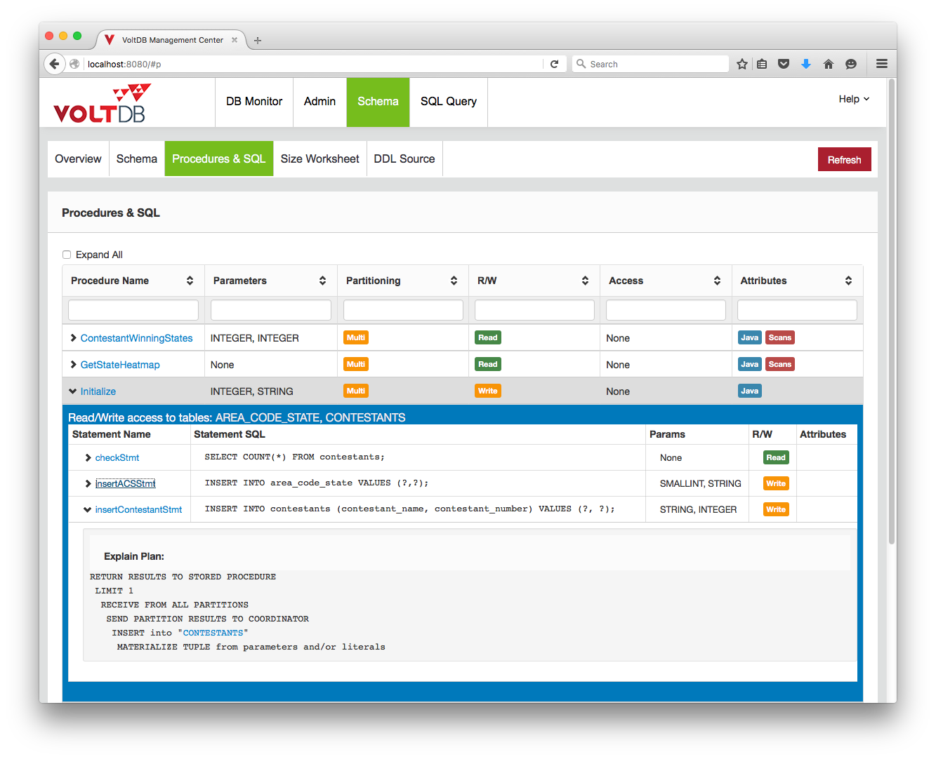 In the Volt Management Center, which is available from a web browser via http:://{server-name}:8080 by default, you can see the execution plans by navigating to the Schema tab, clicking on Procedures & SQL, and expanding the stored procedure to see the individual statements. The execution plan is displayed in the expanded view. The following example shows the execution plan for InsertContestantStmt in the Initialize stored procedure.