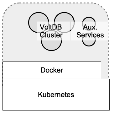 So the basic architecture for running VoltDB is a VoltDB database running on multiple instances of a Docker container inside a Kubernetes cluster. VoltDB also starts one or more auxiliary services as separate pods, such as the Volt Management Center.