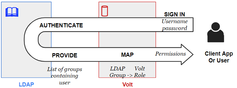 The following diagram shows the overall workflow of LDAP integration at runtime. The user, or client application, connects to the database passing in their LDAP credentials: a username and password. VoltDB passes those credentials to LDAP for authentication. Once the user is authenticated, the VoltDB server then looks for groups in LDAP of which the user is a member. Finally, the LDAP group is mapped to one or more VoltDB roles to decide what permissions the user has.