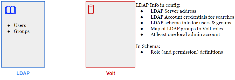 LDAP integration allows VoltDB to use existing resources within LDAP for authentication and authorization. That means that administrators can use the existing user and group definitions within LDAP for security management of VoltDB. Of course, you can always create specific users and/or groups for managing VoltDB access, but it is not necessary. As a result, very little change is needed to an existing LDAP infrastructure; most of the set up for LDAP integration belongs to the VoltDB servers, as shown below.