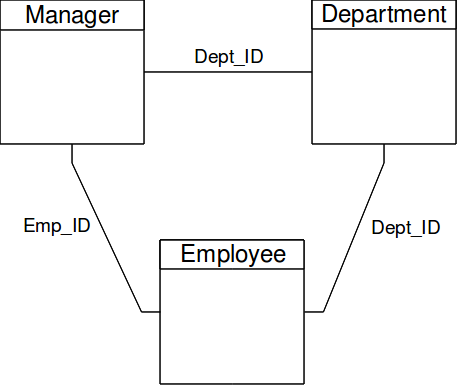For example, assume we have a database that correlates employees to departments. There is a DEPARTMENT table and an EMPLOYEE table, with a DEPT_ID column that acts as a foreign key. But departments have managers, who are themselves employees. So there is a MANAGER table that also contains both a DEPT_ID and an EMP_ID column. The relationship of the tables looks like this: